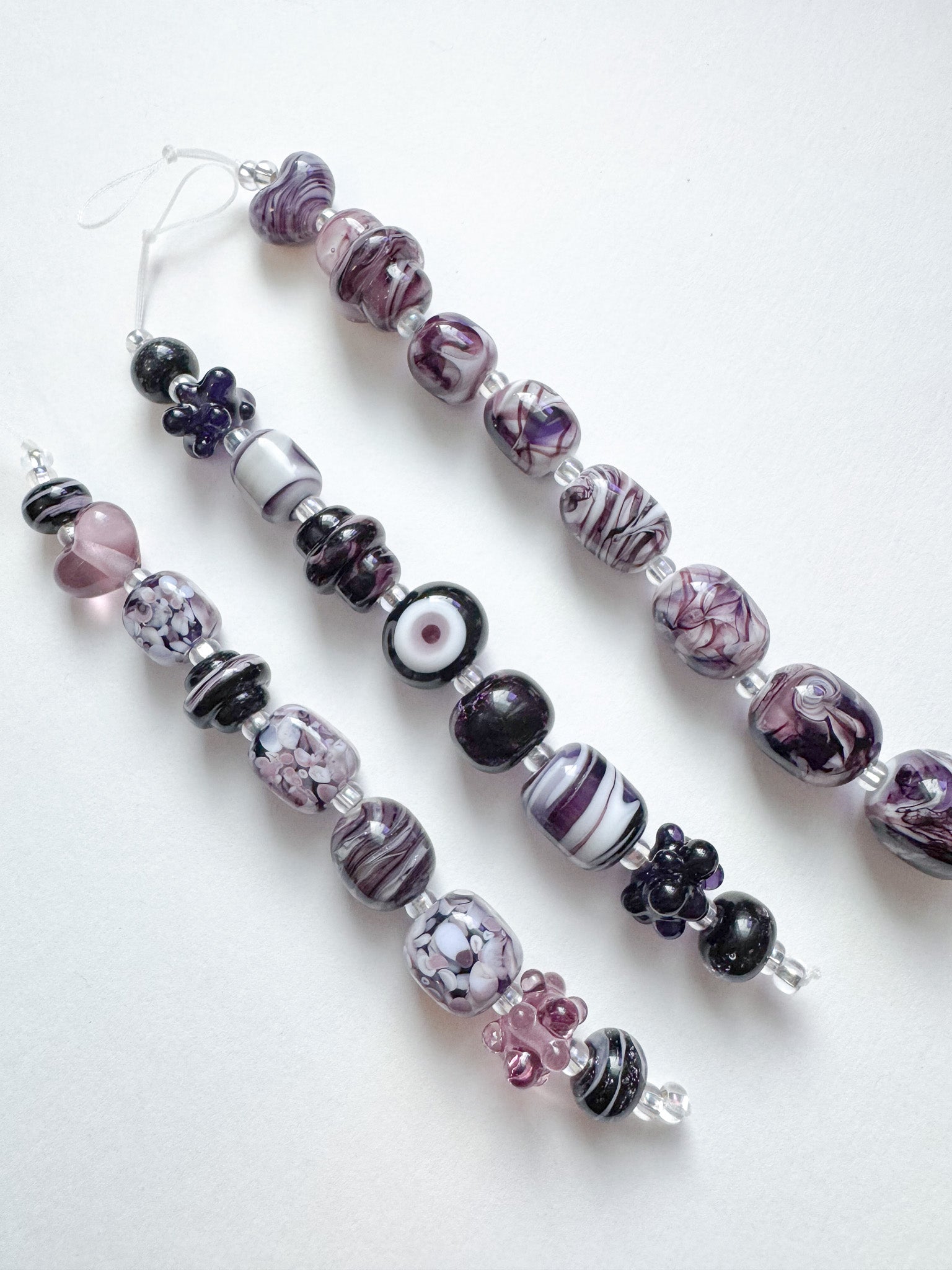 Each bead is made by hand in the flame and kiln-annealed for durability. Subtle variations in colour, shape, and pattern make every set truly one of a kind.